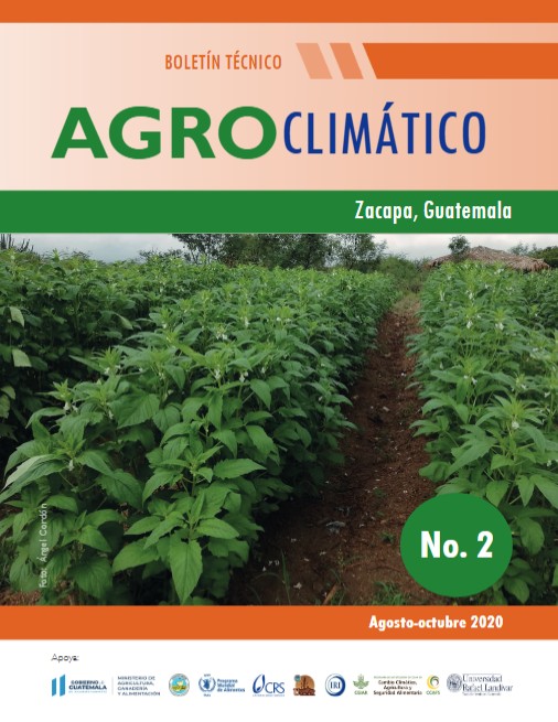 Este boletín técnico No. 2 de la Mesa Técnica Agroclimática de Zacapa, correspondiente a agosto a octubre de 2020, presenta la perspectiva climática basada en años análogos (2003, 2006, 2008, 2013) bajo condiciones neutras del ENOS. Se esperan acumulados de lluvia de 400 a 1000 mm en el departamento, con anomalías positivas del 5% al 20%. La canícula de agosto no será prolongada. El boletín incluye un análisis de impactos del COVID-19 en productores (acceso a semillas, insumos y mercados), una guía para identificar la langosta centroamericana (Schistocerca piceifrons), y reportes de daños por la tormenta tropical Amanda. Ofrece recomendaciones para siembra de segunda, manejo de humedad y conservación de suelos.
